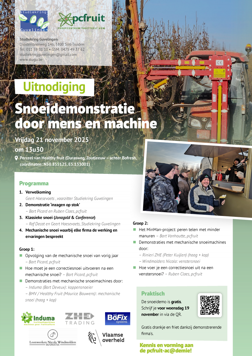Ben jij graag aanwezig op de snoeidemo door mens en machine? Schrijf je in voor 19 november! De snoeidemonstratie gaat door op een perceel van Healthy Fruit (Durasweg, Zoutleeuw - achter Bofresh: coördinaten: N50.855125, E5.133001)