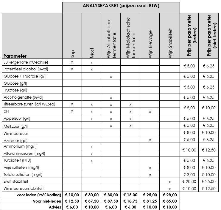 Op pcfruit bieden wij sinds 2023 analyses van wijn of most aan. Vanaf het voorjaar van 2024 is het mogelijk daarbij advies te bekomen. Per levering wordt een behandelingskost van €20 aangerekend. De volgende analyse pakketten zijn mogelijk: